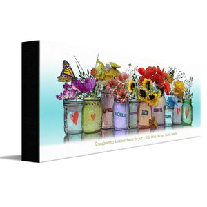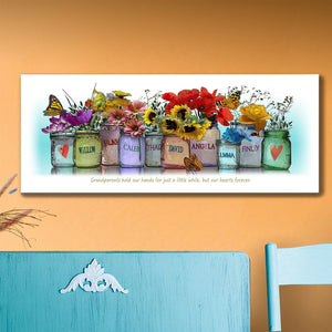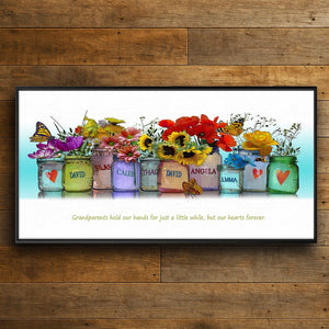 The Mason jars are personalized with the names of grandchildren and the quote at the bottom of the print reads: "Grandparents hold our hands for just a little while, but our hearts forever".