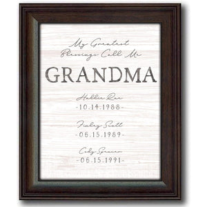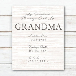 A beautiful art print that features the text "My Greatest Blessings Call Me Grandma" and is personalized with the names of her grandchildren and their birthdates.