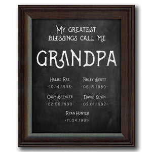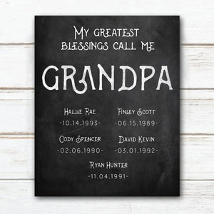 A beautiful art print that features the text "My Greatest Blessings Call Me Grandpa" and is personalized with the names of your grandchildren and their birthdates.