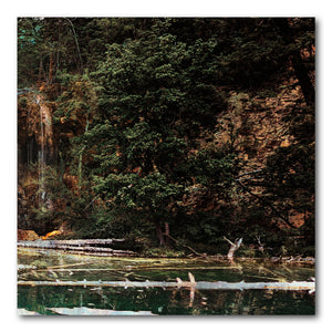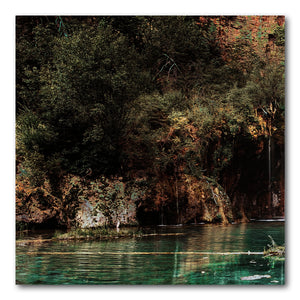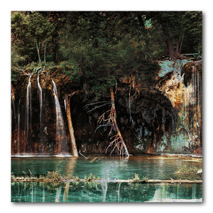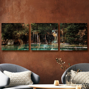 This extra-large display of three art landscape panels is available in three size options as a wooden Stretched Canvas print or a premium gallery wrapped canvas. It features artist photography from Hanging Lake from the Southern Rocky Mountains in Colorado. The depth of contrast and colors, from the turquoise water to the sunlight and shadows on the rocks and trees creates a beautiful composition to explore.