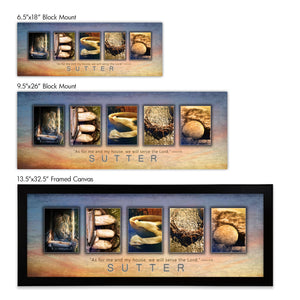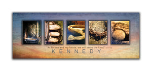 The religious artwork is personalized with your family name below the verse, "As for me and my house, we will serve the Lord."