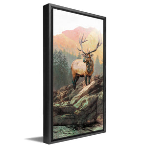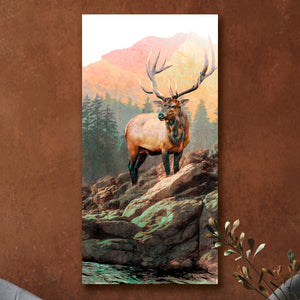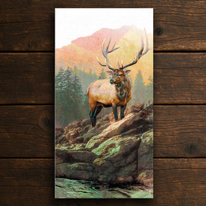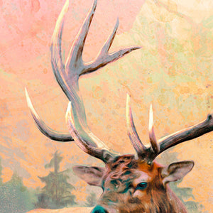 This print features a majestic figure of a bull elk standing tall and proud in Colorado's Rocky Mountains. With bold texture and a rich color palette, this print imbues the elk with a mythic presence. Its antlers are massive, branching out like the limbs of a great tree, and its fur is rendered with a sense of depth and texture that invites the viewer to touch it. This print truly captures the essence of this powerful animal.