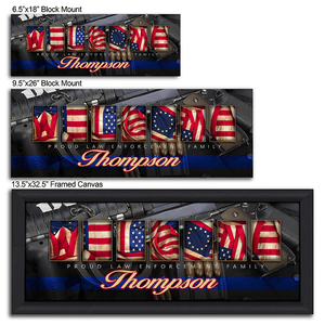 - Below the American Flag lettering reads "Proud Law Enforcement Family," and the print is personalized with your family name!