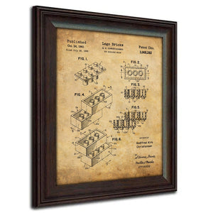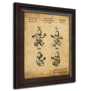 Based on the actual original patents of Lego building bricks and Lego toy figures artistically set on a vintage paper background. Each print is published in our USA studio and finished behind glass in a 14"x17" contoured frame with a brown wood-grain
