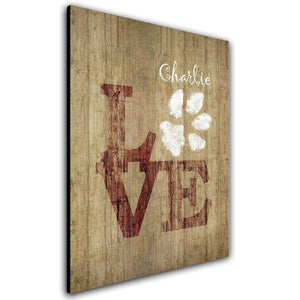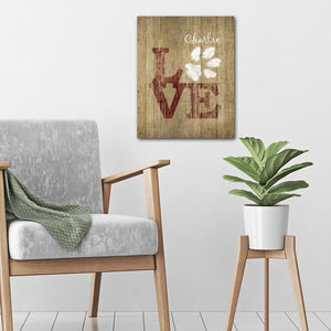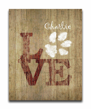 This fun and contemporary personalized print for the dog lover spells LOVE with the "O" as a paw print and your dog,s name included as a part of the art. You can always be reminded of your four-legged friend with this wood block art hanging in your entryway, kitchen, or your dog’s favorite napping place.
