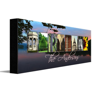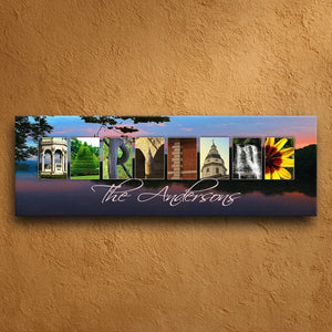 This creative and colorful Maryland art print features photography from the beautiful state to spell out its name. Below the photos, there is a space to add your family name or word of your choice to the personalized art! Simply enter your desired personalization in the input box below and let our artists do the rest.