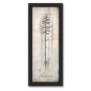 This personalized gift features tall trees, a Whitetail Deer buck and your name, customized at the bottom of the print, as a part of the artwork. It makes for a unique personalized gift and beautiful rustic décor addition to any room.