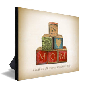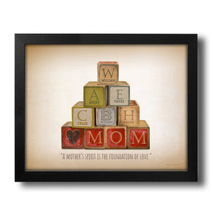 The supporting blocks of the artwork are three blocks block that says “MOM,” with up to ten additional blocks stacked and personalized with her children’s names. Just enter your personalization and let our team of artists bring it to life in a piece that symbolizes the strength, support, and love she gives every day.