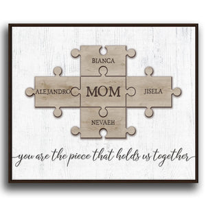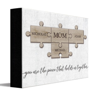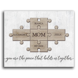 This special personalized gift for mom features the names of her children etched into the puzzle pieces. The quote below reads, "You are the piece that holds us together".