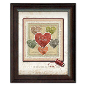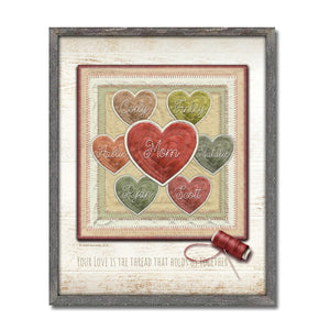 This special personalized gift for mom features the names of her children "stitched" into the hearts. The quote below reads, "Your love is the thread that holds us together".