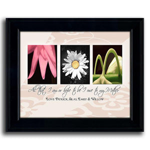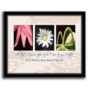 The floral photos in the framed flower print spell "MOM" and each print includes your custom personalization as a part of the image. Just above the personalization, the sentimental quote reads: "All that I am or hope to be I owe to my Mother".