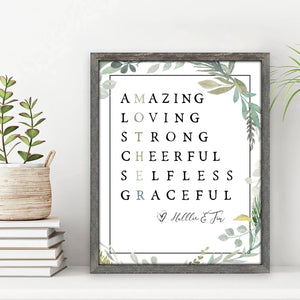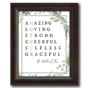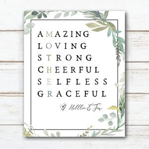 Amazing, Loving, Strong, Cheerful, Selfless, Graceful... the second letter of each word spells "Mother". Below the poem, there is a heart and the customized names of your choice.