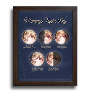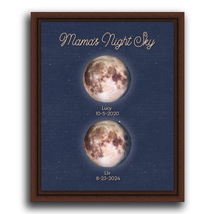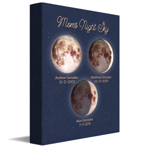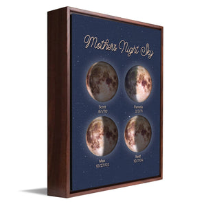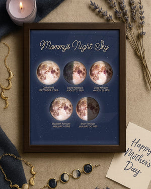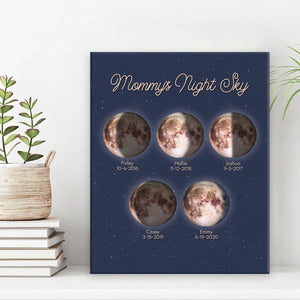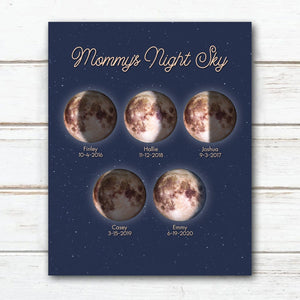 This special personalized gift captures the timeless allure of a starry night sky, personalized with the names of your cherished children and the unique moon phase from their birth dates. With your children,s names beneath their birth moon phases, this artwork captures the magic of their arrival, eternally linked to their unique moon phase during that special moment. It,s not just a print; it,s a heartfelt ode to the love that illuminates your world. Embrace the magic of the night sky and the eternal bond of motherhood with ,Mother and Children Night Sky,."