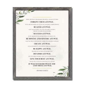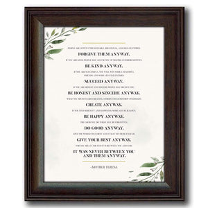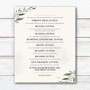 A beautiful art print that features the inspirational "Anyway" quote from Mother Teresa.
