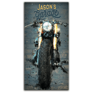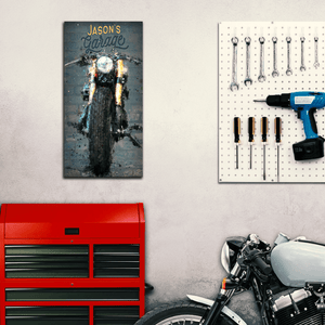 Personalized motorcycle garage sign featuring your name as a part of the artwork. Available as a Stretched Canvas or a gallery wrapped canvas. Simply enter your customization in the input box below and let our artists do the rest... made in the USA, ships ready to hang and enjoy!