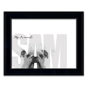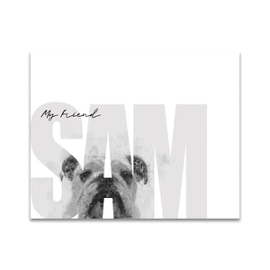 Celebrate your pet Bulldog with this contemporary personalized art print that includes your pet,s name customized as a part of the image. Simply enter your pet,s name in the input box below and our artists will create a beautiful image with the Bulldog peeking through the font. It makes a perfect unique gift for dog lovers, Bulldog owners & Bulldog breeders.