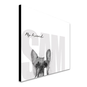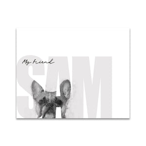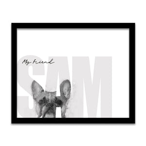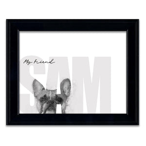 Celebrate your pet French Bulldog with this contemporary personalized art print that includes your pet,s name customized as a part of the image. Simply enter your pet,s name in the input box below and our artists will create a beautiful image with the Frenchie peeking through the font. It makes a perfect unique gift for dog lovers, French Bulldog owners & breeders.
