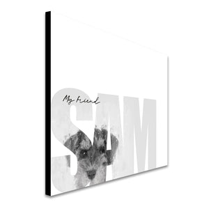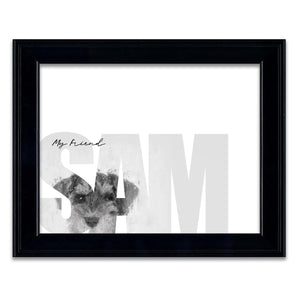 Celebrate your pet Mini Schnauzer with this contemporary personalized art print that includes your pet,s name customized as a part of the image. Simply enter your pet,s name in the input box below and our artists will create a beautiful image with the Mini Schnauzer peeking through the font. It makes a perfect unique gift for dog lovers, Mini Schnauzer owners & breeders.