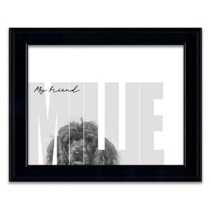 Celebrate your pet Poodle with this contemporary personalized art print that includes your pet,s name customized as a part of the image. Simply enter your pet,s name in the input box below and our artists will create a beautiful image with the Poodle peeking through the font. It makes a perfect unique gift for dog lovers, Poodle owners & Poodle breeders.