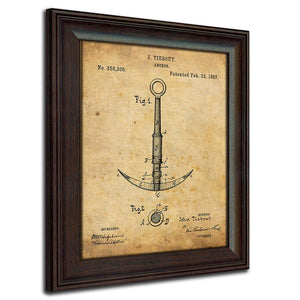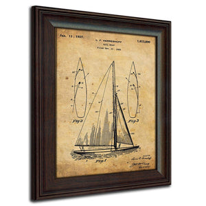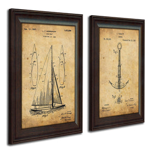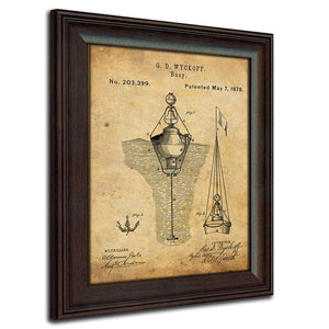 Art based on the actual and original US patents for a sailboat (1925), an anchor (1887) and a buoy (1878). These historical drawings are artistically set on a vintage paper background. Each art print is published in our USA studio and finished behind glass in 14"x17" contoured frame with a brown wood-grain
