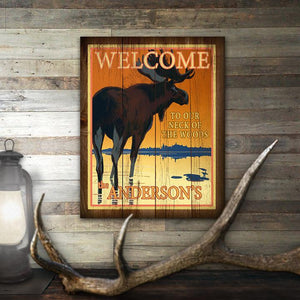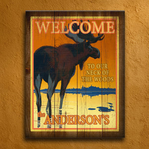 This vintage style art illustration depicts a bull moose and reads "Welcome to our neck of the woods". It also features your personalization at the bottom of the print as a natural part of the art.