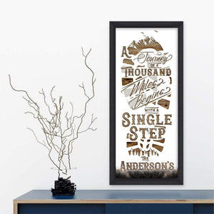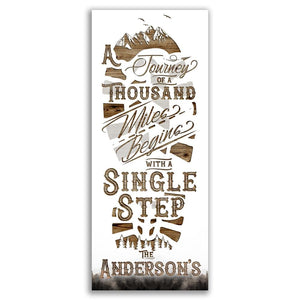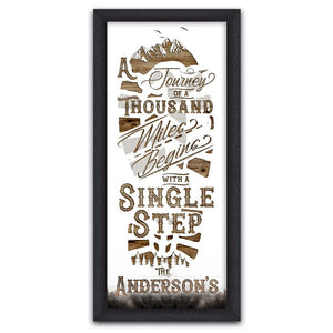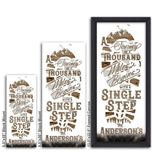 Each print features your personalized name (or names) below the inspirational quote which reads... "The journey of a thousand miles begins with a single step".