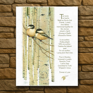 This all-time favorite personal print is a truly unique romantic wall decor gift. It is published from the original watercolor painting by artist Scott Kennedy and depicts two Black Capped Chickadees nestled together on an aspen limb. Each nature wall decor print is individually personalized with your names or initials "carved" into the heart on the aspen tree.