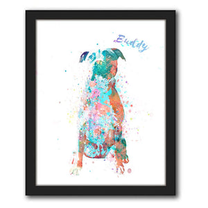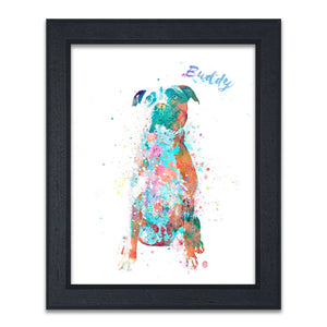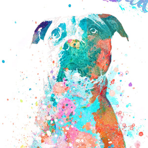 Celebrate your Pit Bull with this colorful personalized print that includes your pet,s name customized as a part of the image. Created in a colorful watercolor style, this Pit Bull art print makes a special gift for the dog owner, Pit Bull breeder, or as a special personalized pet memorial.