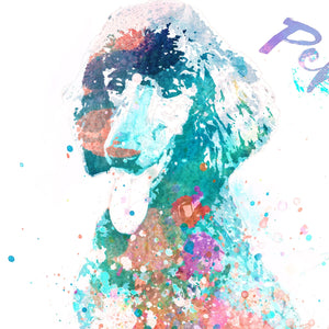 Celebrate your Poodle with this watercolor pet portrait that is customized with your pet,s name as a part of the image. This fun colorful dog art print makes a great personalized gift for the Poodle owner, breeder or as a special personalized pet memorial for a lost Poodle friend.