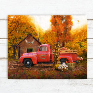 This nostalgic art print is customized for you with the text of your choice on the side of the old red truck. It is a beautifully detailed painting that makes a great gift for Thanksgiving, Halloween or any special Fall occasion.