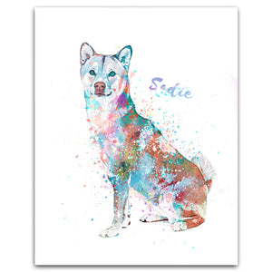 Celebrate your Shiba Inu with this colorful personalized print that includes your pet,s name customized as a part of the image. Created in a colorful watercolor style, this Shiba Inu art print makes a special gift or pet memorial.