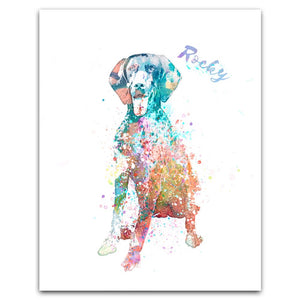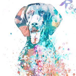 Celebrate your German Shorthaired Pointer with this colorful watercolor pet portrait that is customized with your pet,s name as a part of the image. It makes a truly special dog gift for the pointer dog owner, breeder or as a special personalized pet memorial in memory of a lost dog friend.