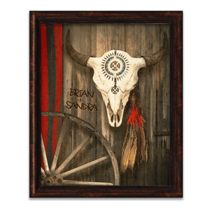 "Kindred Spirits" is a beautiful Southwestern art gift that is rich in detail and has your personalization ,carved, into wall as a part of the artwork. Featuring an ornate American Bison Skull and your customization.