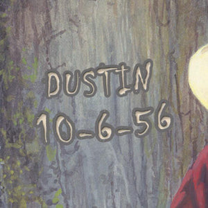 "Time to Sharpen" is a fitting title for this personalized art print as the hunter is sharpening his knife... perhaps it is really time to sharpen his senses as a trophy Whitetail Buck approaches from behind. Each print is a one-of-a-kind as it can be customized with your personalization ,carved, on the tree. Personalize with one or two names and even a special date.