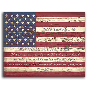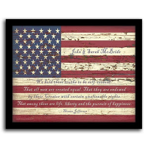 Show off your national pride with our patriotic American Flag art. It features your personalization above the Thomas Jefferson quote: