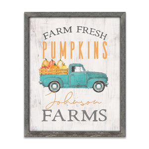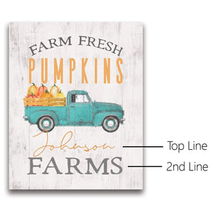 The text at the top of the image reads "Farm Fresh Pumpkins" and below the vintage truck, both lines of text are personalized for you. The personalization is created as a part of the artwork. Simply enter your personalization details in the input box below and let our artists do the rest.