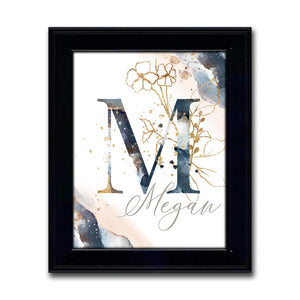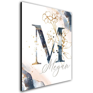The gold floral accents pop against the blue and peach abstract watercolor background in this simple and elegant personalized art.