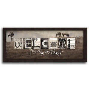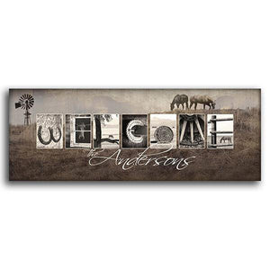 Photos used to spell "Welcome" include horseshoes, horses, haybales, wooden fencing, an old wagon wheel and more. Shop here for unique country gifts, horse wall art, western décor & personalized welcome signs.