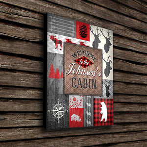 This rustic decorative sign by designer Cody Johnson features a red, grey and white Buffalo Plaid background with silhouettes of moose, elk, deer, bear, trees, a compass and more. The text reads "Welcome to the... Cabin" with your personalized name as a part of the artwork.