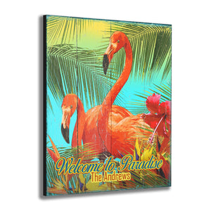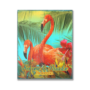 This brightly colored tropical art features flamingos and your personalization as a part of the artwork.