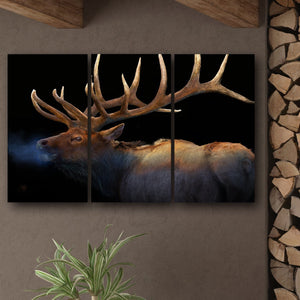 Set of 3 prints feature a massive Bull Elk with a beautiful contract of a dark background, the sun touching his back and antlers, as well as the frosted air from his breath.