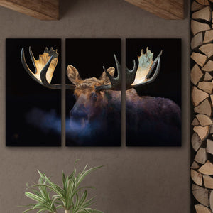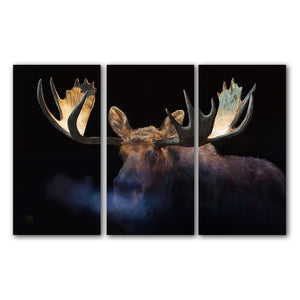 Set of 3 prints feature a massive Bull Moose with a beautiful contract of a dark background, the sun touching his antlers, as well as the frosted air from his breath.