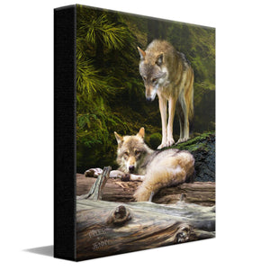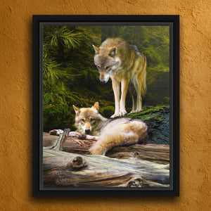 This stunning personal print by wildlife artist Scott Kennedy features two beautiful gray wolves and your name(s) personalized as part of the print. Your names will be made as a part of the artwork, ,carved, into the log in the lower left corner of the image.