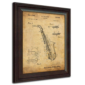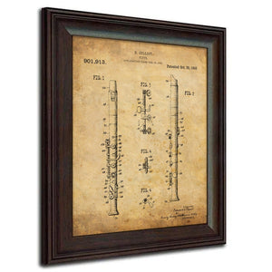 Based on the actual original patents of woodwinds musical instruments artistically set on a vintage paper background. Each print is published in our USA studio and finished behind glass in a 14"x17" contoured frame with a brown wood-grain