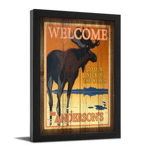 This vintage style art illustration depicts a bull moose and reads "Welcome to our neck of the woods". It also features your personalization at the bottom of the print as a natural part of the art.