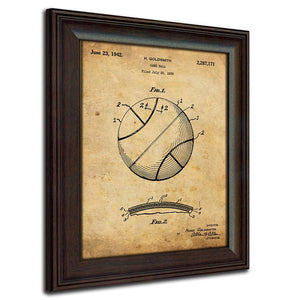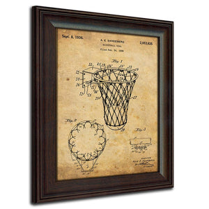 This set of 2 framed prints features the patents for a basketball and goal. Based on the actual drawings of patents filed in the US, these modern prints are set against a vintage paper background and paired with other themed prints! These prints are a perfect fit for any decor. Each of the prints is finished behind glass in a 14"x17" contoured frame with a