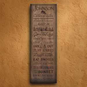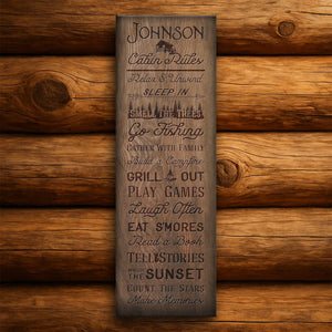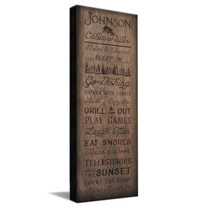 Family cabin rules: relax and unwind, sleep in, smell the trees, go fishing, gather with family, build a campfire, grill out, play games, laugh often, eat s'mores, read a book, tell stories, watch the sunset, count the stars, make memories.