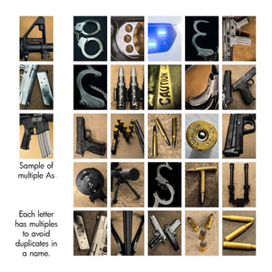 Customize your name art with three to eleven characters. Preview your personalized artwork by typing out the name and hitting the “Preview” button. Click on any letter to choose another law enforcement-themed image or click on the background to try other backgrounds as well. Create your own today!