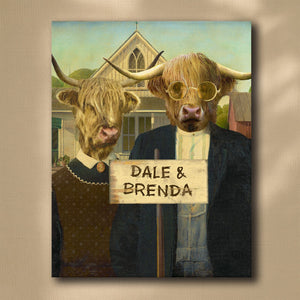 This fun adaptation of the classic 20th-century painting, American Gothic, features two highland cows and your personalization on the sign. It makes a great customized gift for any special occasion and fun farmhouse décor for your country home.