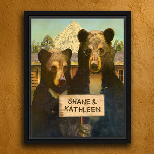 This fun adaptation of the classic 20th-century painting, American Gothic, features two black bears and your personalization on the sign. It makes a great customized gift for any special occasion and fun rustic décor for your home or cabin.